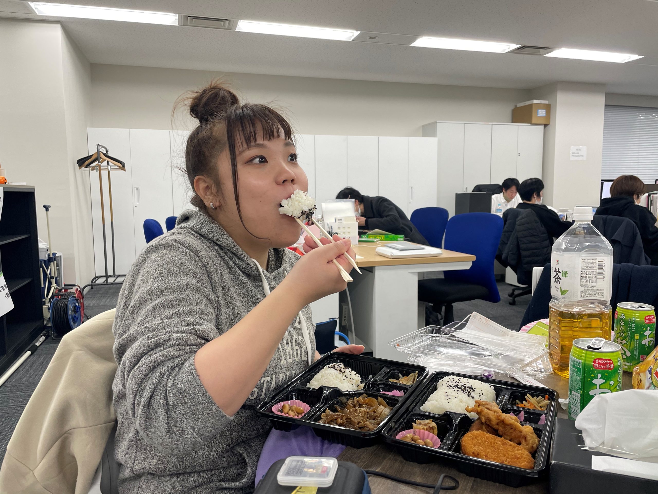 ロケから帰ってきて眠たい目をこすりこすりロケ弁や余ったお菓子を食べながら作業してます笑