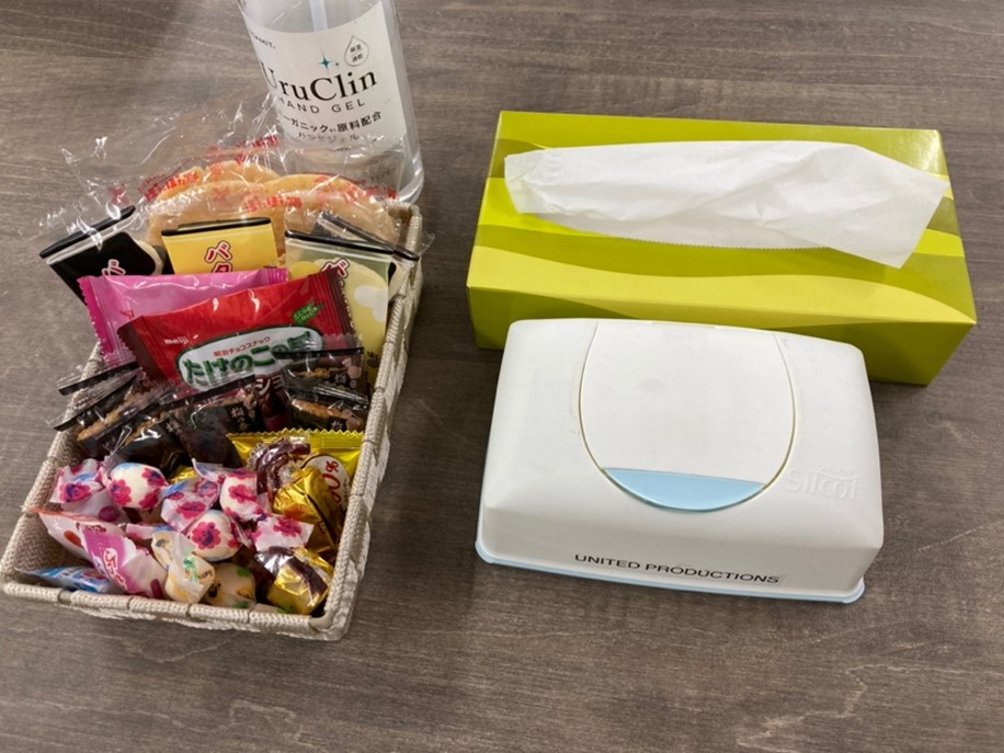 ティッシュ・ウェットティッシュ・消毒液・ゴミ袋・お菓子。